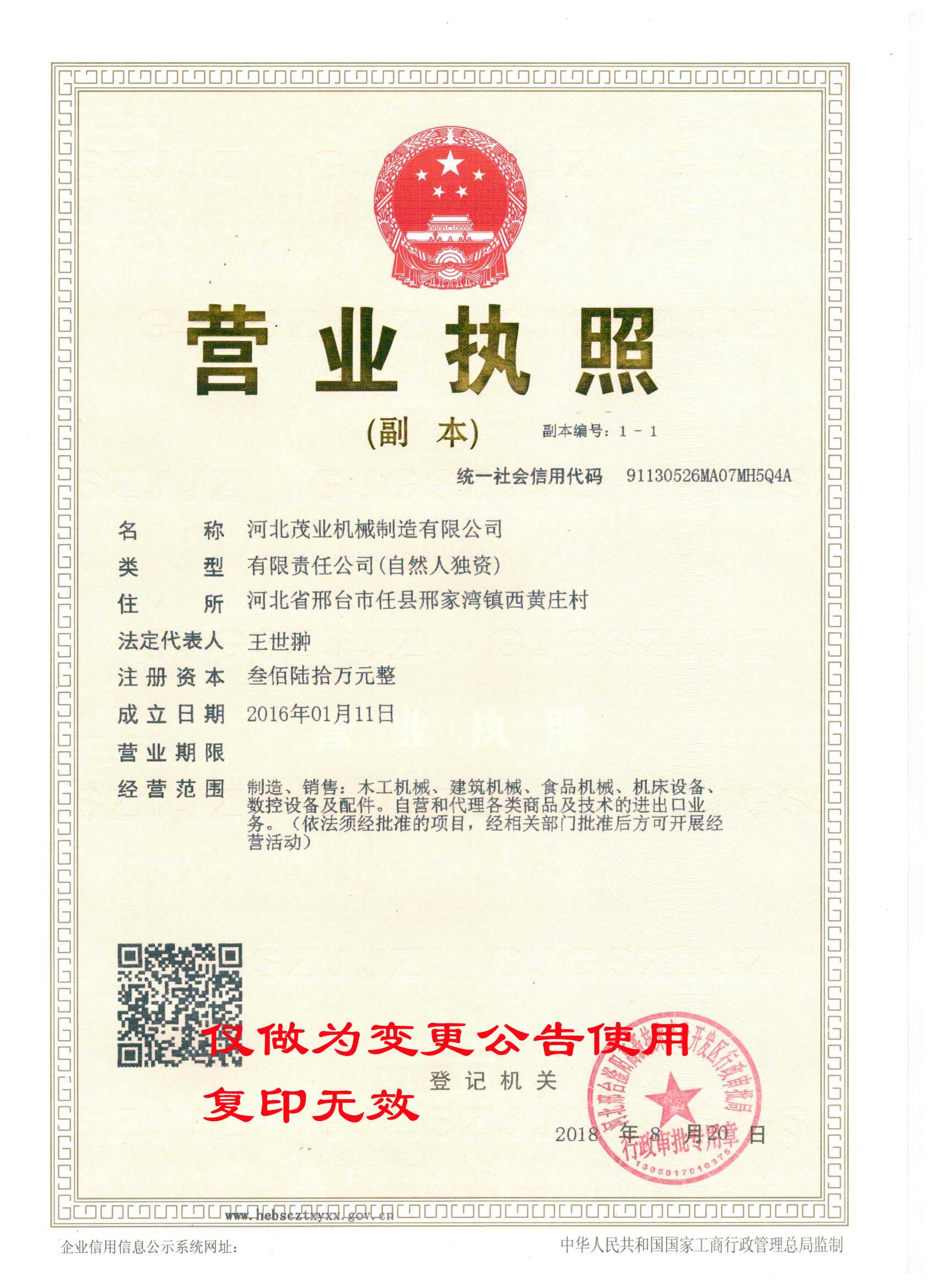 我司邢台茂业机械制造有限公司,因公司业务发展的需要,现已整体变更为河北茂业机械制造有限公司,并于2018年8月20日取得河北邢台滏阳高新技术产业开发区审批局颁发的营业执照。现将有关事项公告如下: